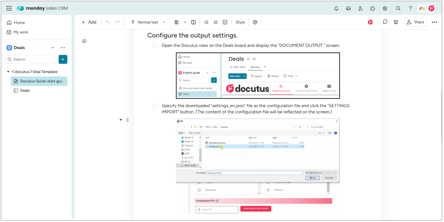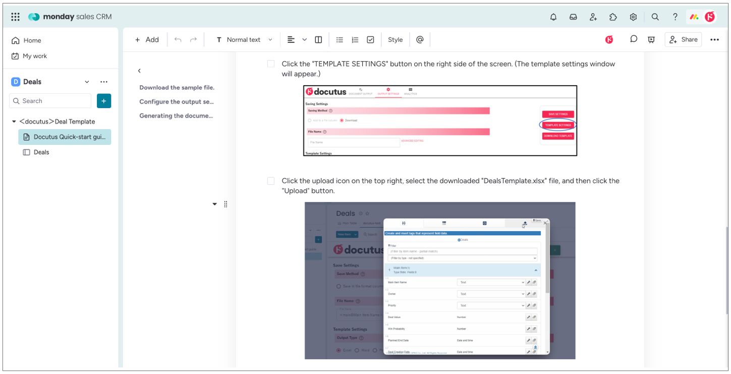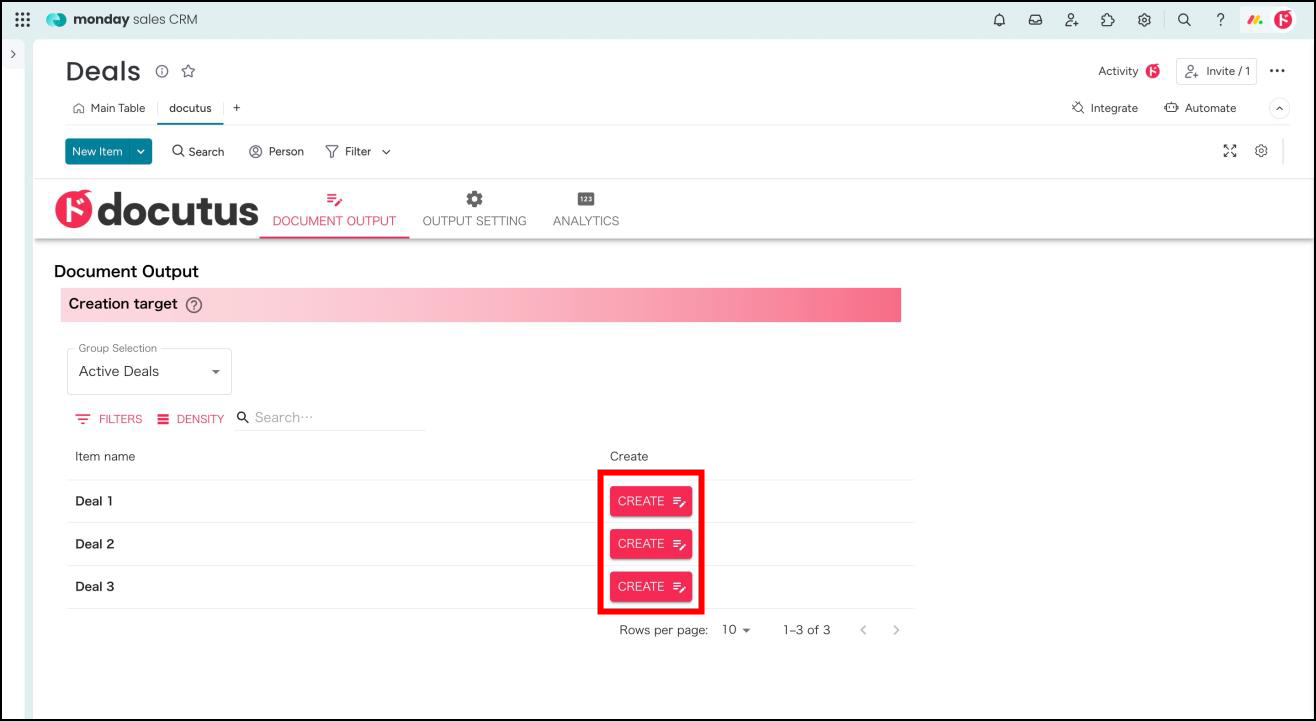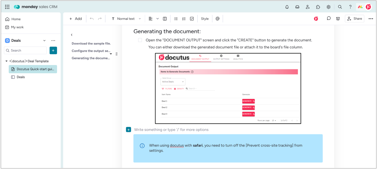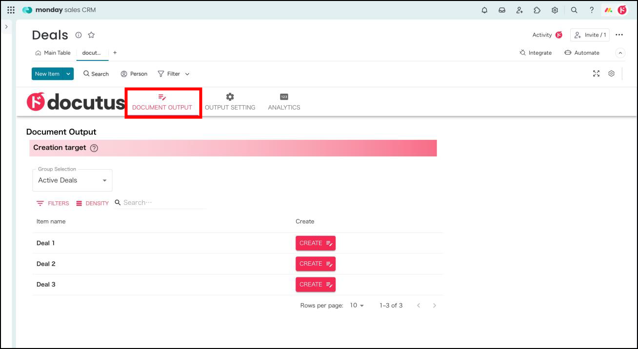 Open the docutus view on the Deals board and bring up the [DOCUMENT OUTPUT] screen.