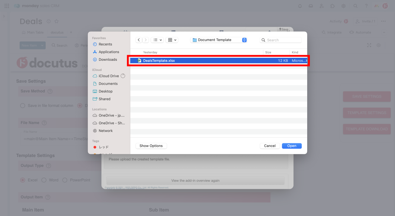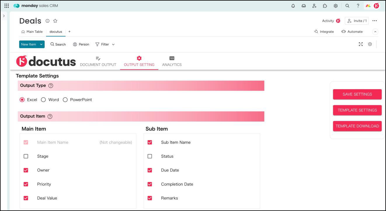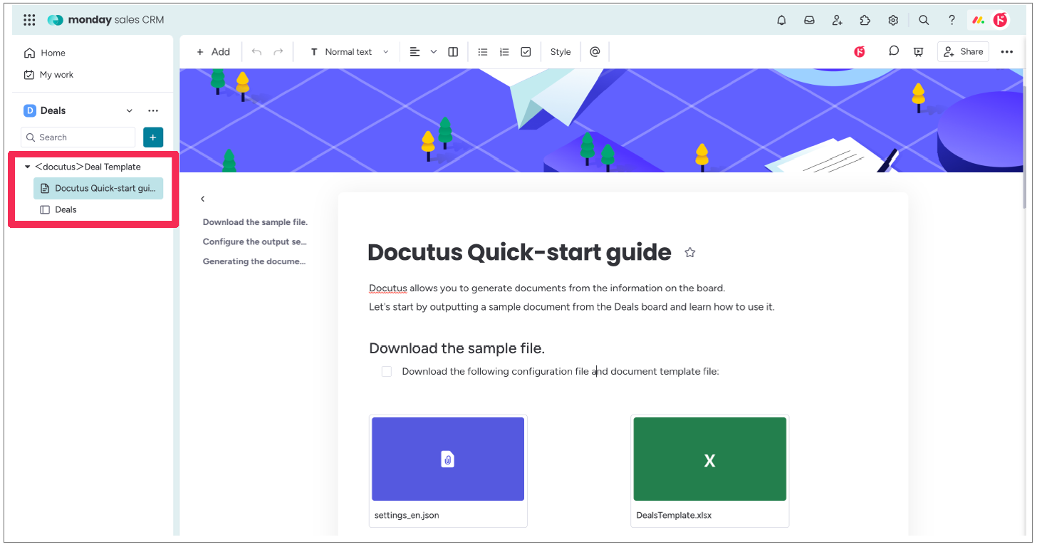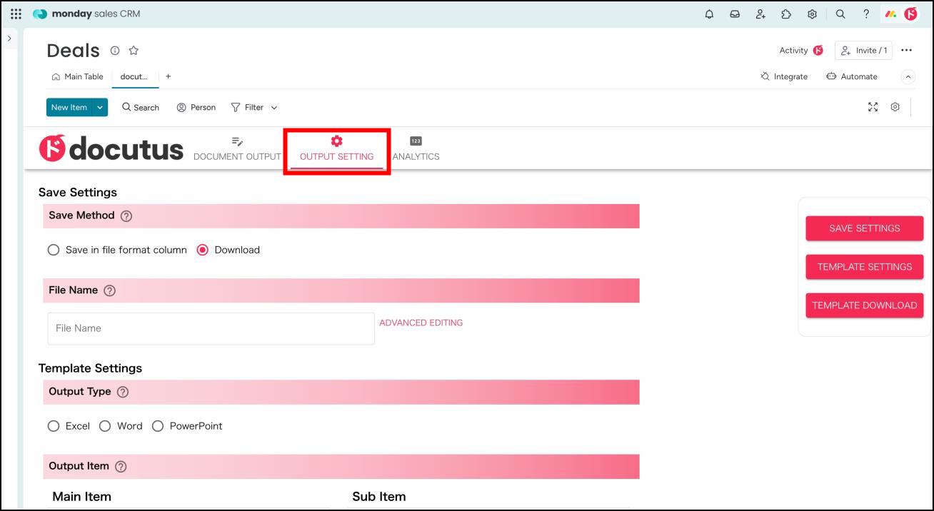 Open the docutus view on the Deals board and bring up the [DOCUMENT OUTPUT] screen.