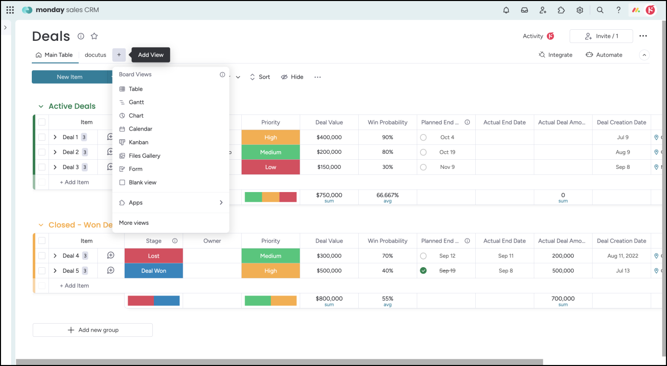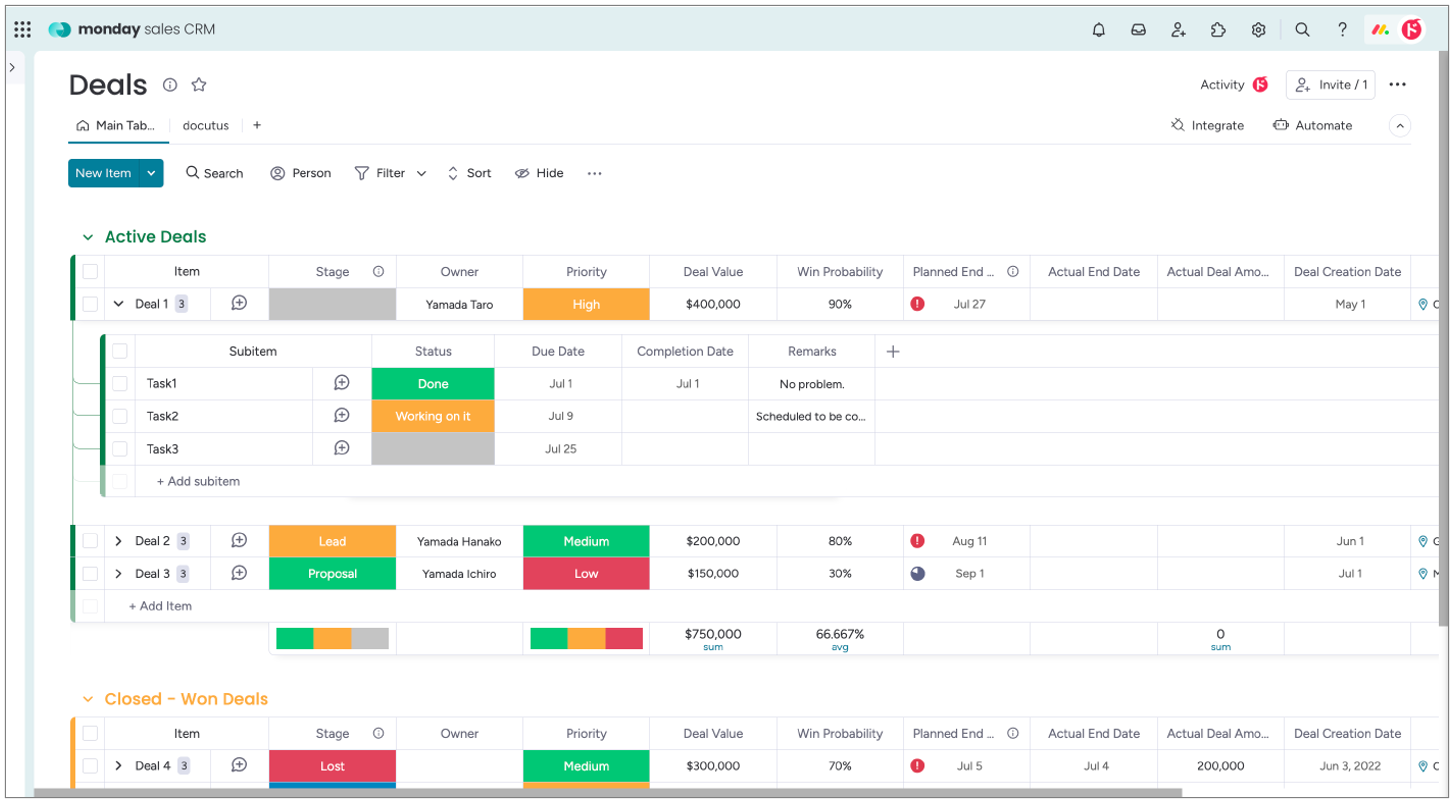 The [Main Table] view lists the item "Active Deals Deal 1" in the CRM.