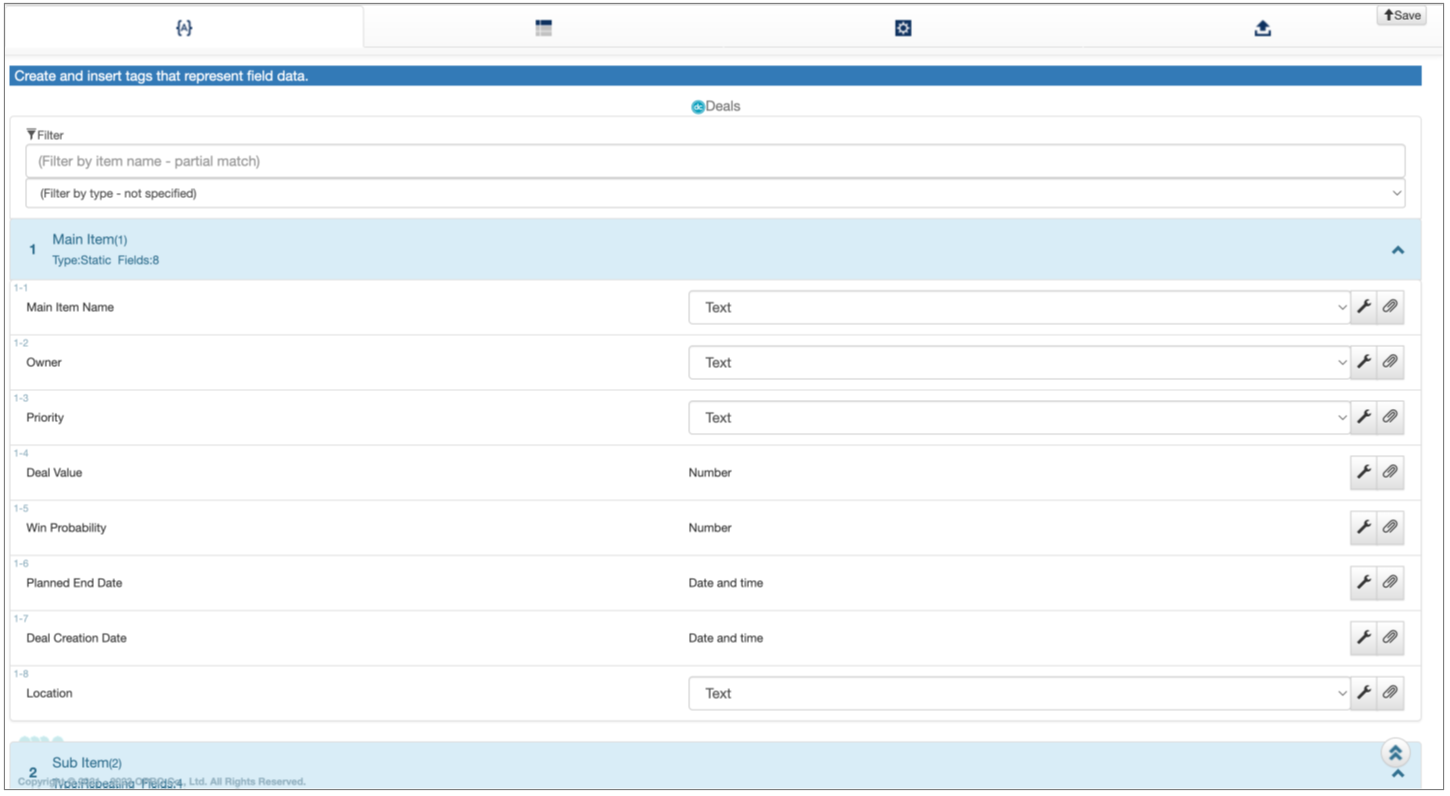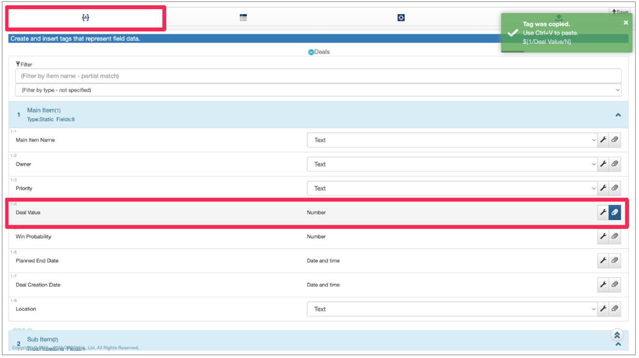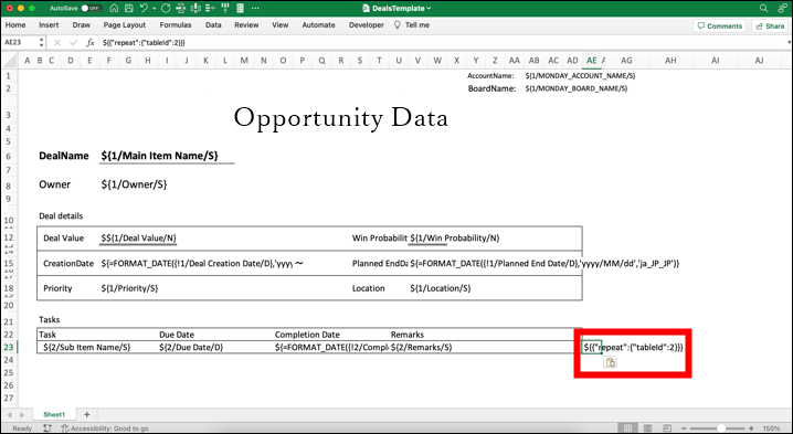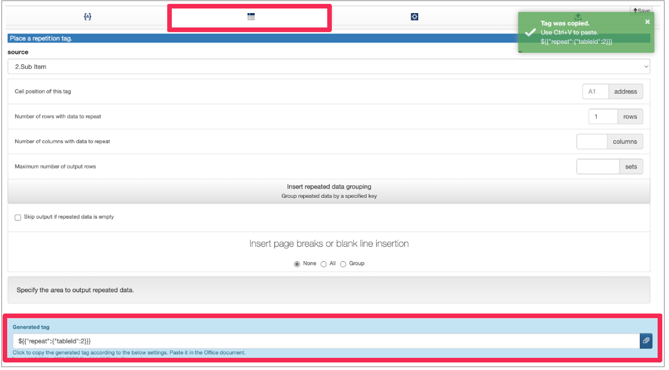 9. When using consecutive data in Sub Items, paste the repeat tag found under "Place a repetition tag” in TEMPLATE SETTING into the Excel File.