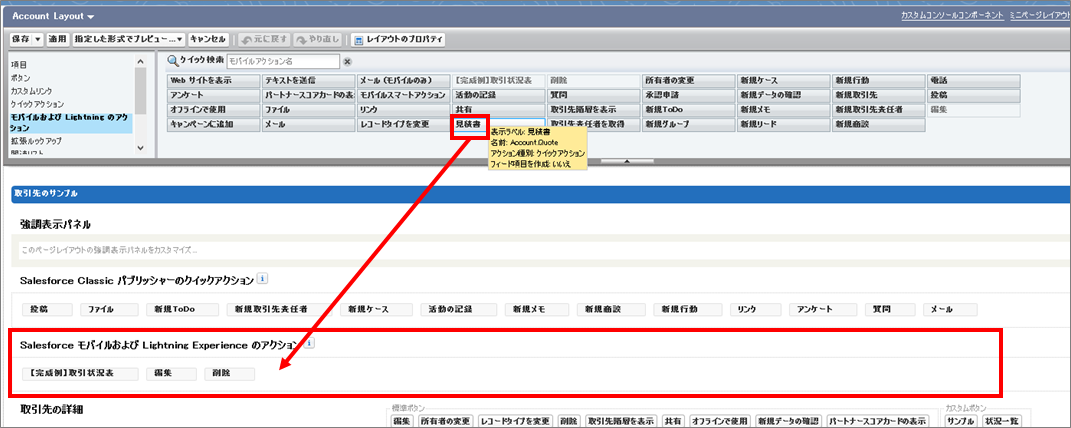 「モバイルおよびLightningのアクション」の中から作成したアクションを選択し、下部の「SalesforceモバイルおよびLightning Experienceのアクション」にドラッグ&ドロップで表示します。