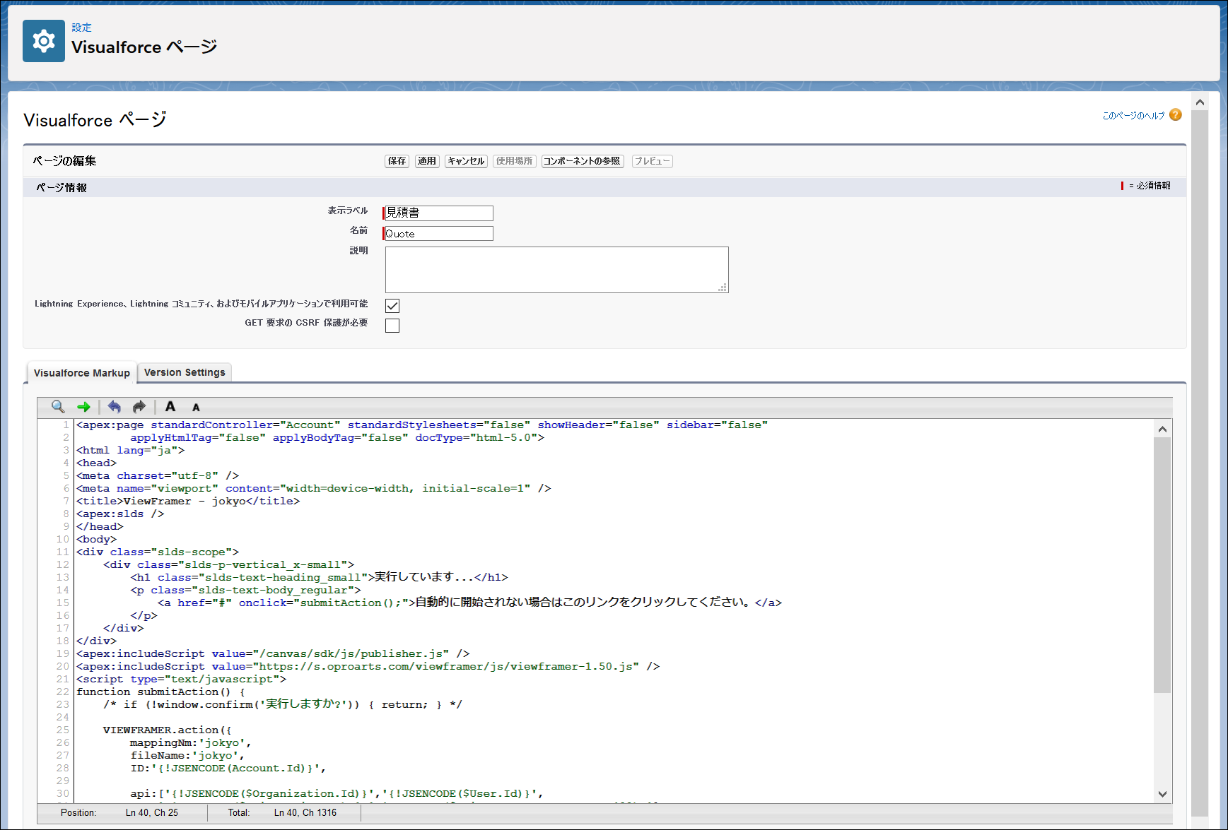 - 内容(Visualforce Markup)に、1でダウンロードしたテキストファイルの中身を貼り付ける