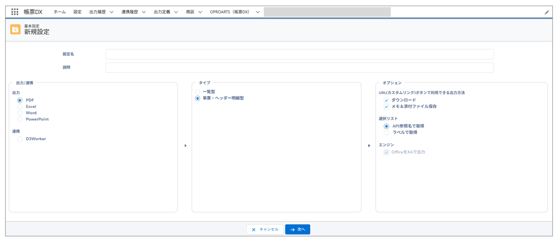 帳票の基本的な情報と出力形式を設定します。