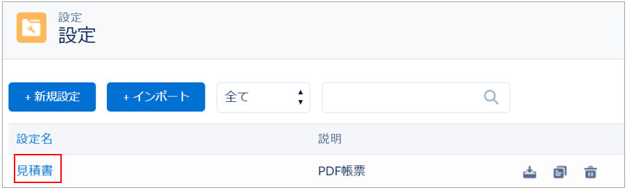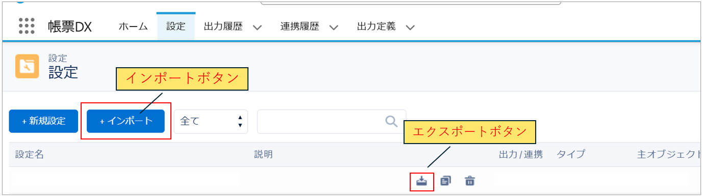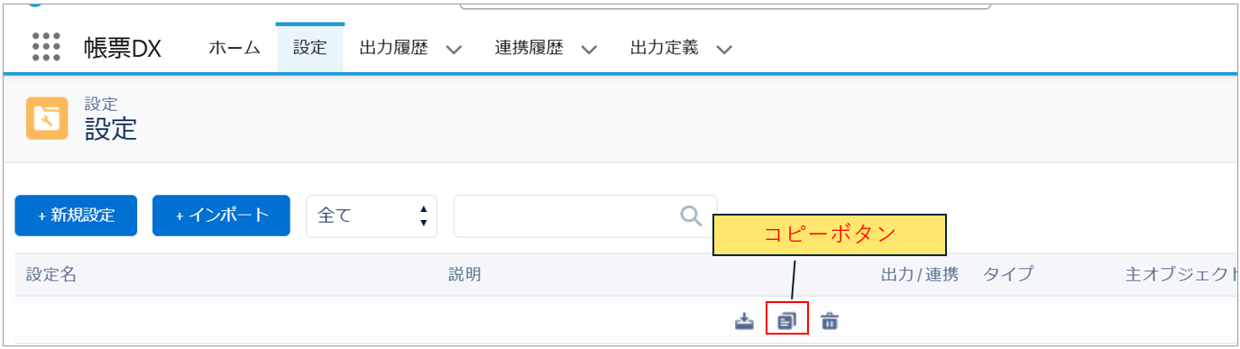 帳票DX for Salesforceでは、作成した「設定」の「インポート」「エクスポート」「コピー」が可能です。