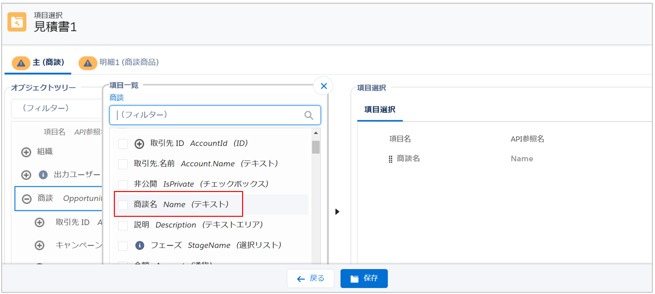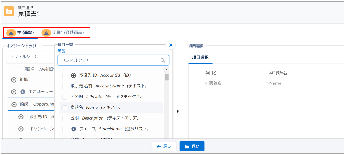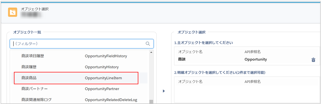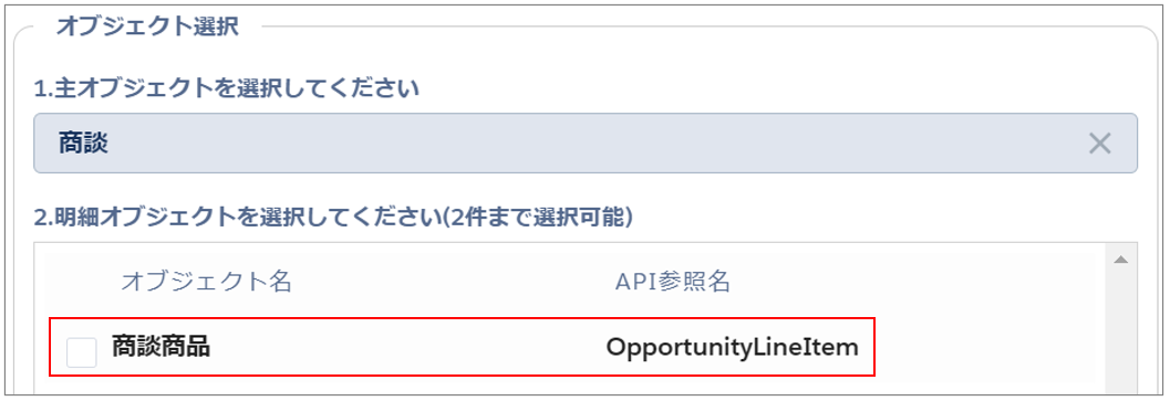 例:「商談商品」オブジェクト💡補足明細オブジェクトは2件まで選択できます。