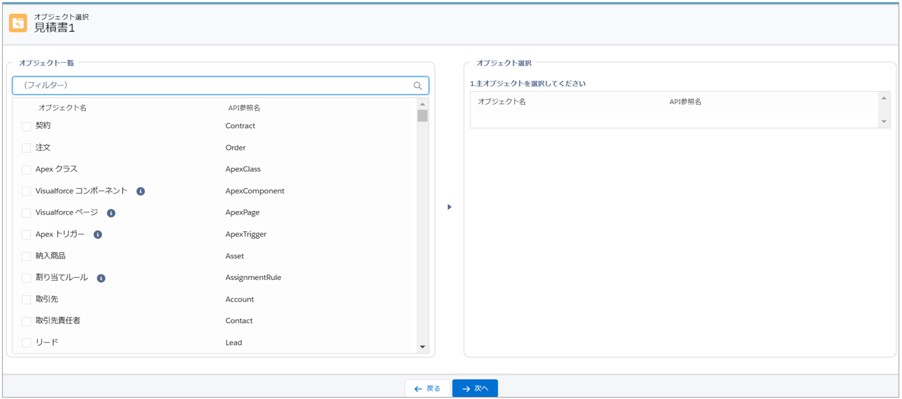 - ヘッダー明細型:主従関係のオブジェクト(主オブジェクトと明細オブジェクト)を選択します。