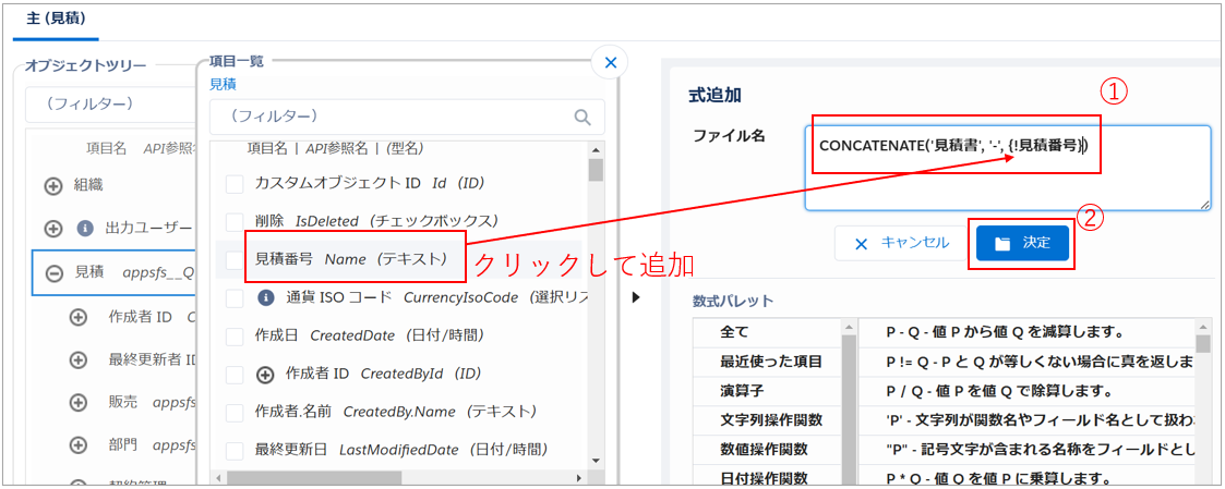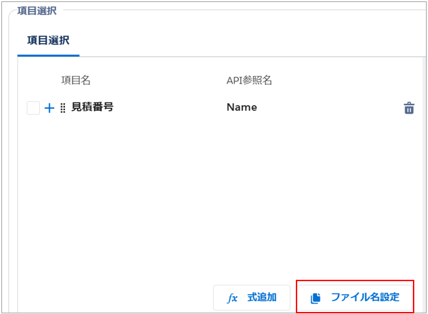 例)固定の文字列「見積書」と「見積番号」項目を結合し、ファイル名「見積書_見積番号」を作成💡補足未指定の場合は、ファイル名が