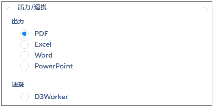 選択可能な出力形式はPDF、Excel、Word、PowerPointです。