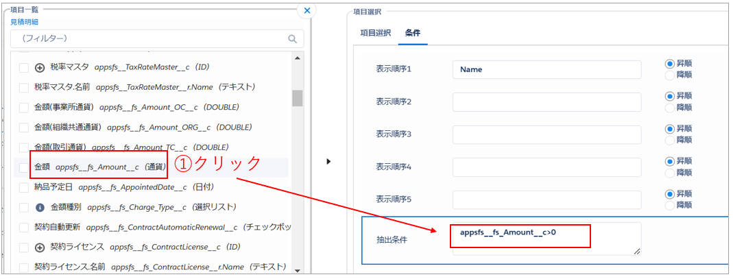 例:「金額」項目の値が0より大きいレコードのみ取得