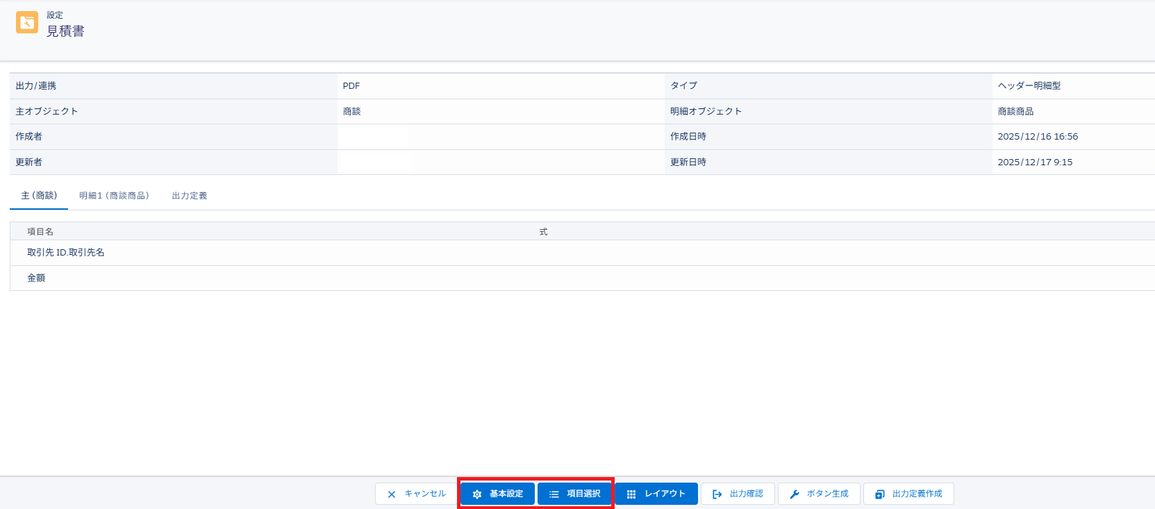 設定を変更する場合は、「基本設定」ボタンや「項目編集」ボタンをクリックします。