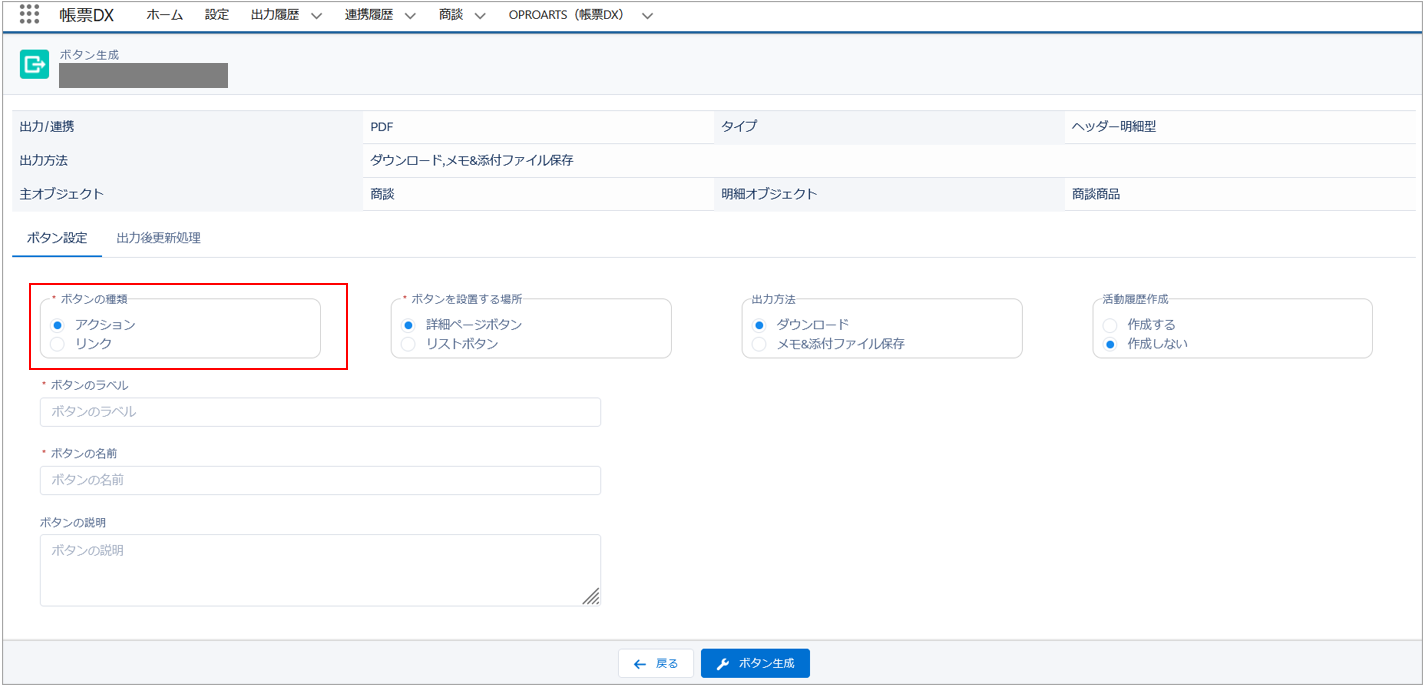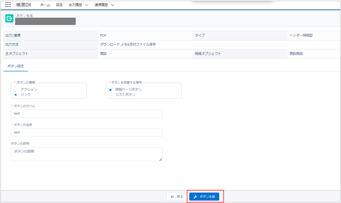 2-1.「【帳票DX for Salesforce ユーザガイド(3)】帳票作成」で作成した帳票設定の画面で、[ボタン生成]ボタンをクリックします。