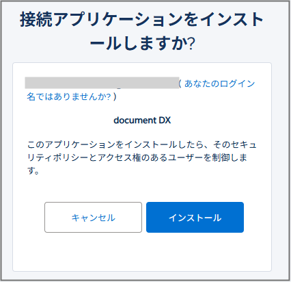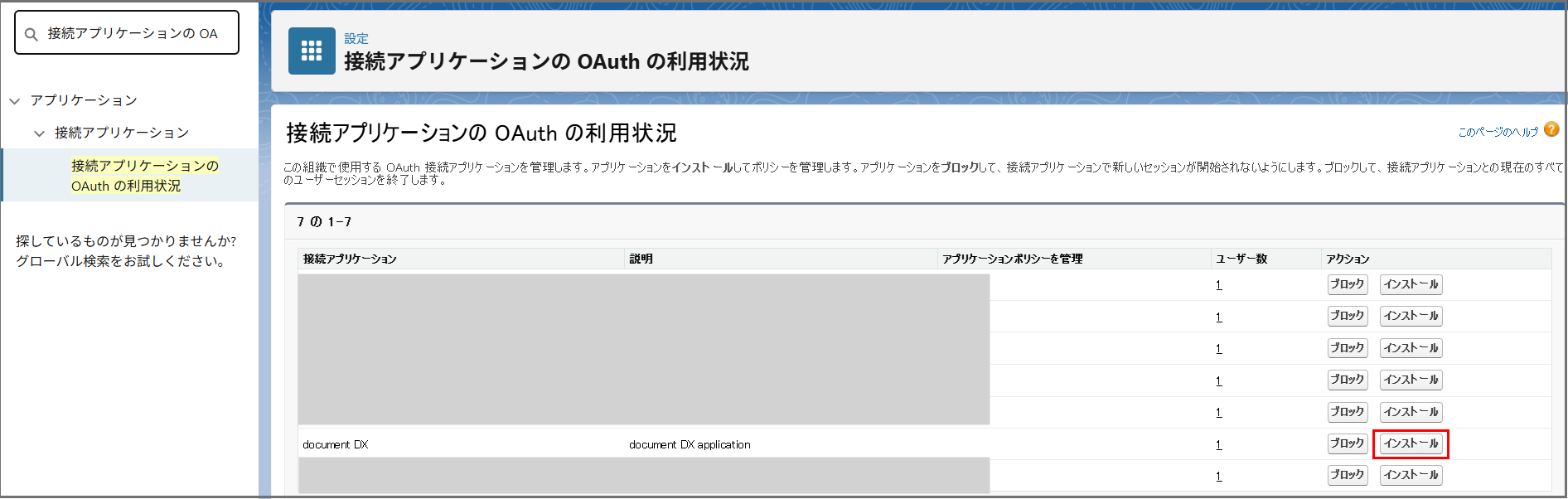 6-7.システム管理者でログインし、[設定] > 「接続アプリケーションの OAuth の利用状況」で「document DX」の[インストール]ボタンをクリックする。