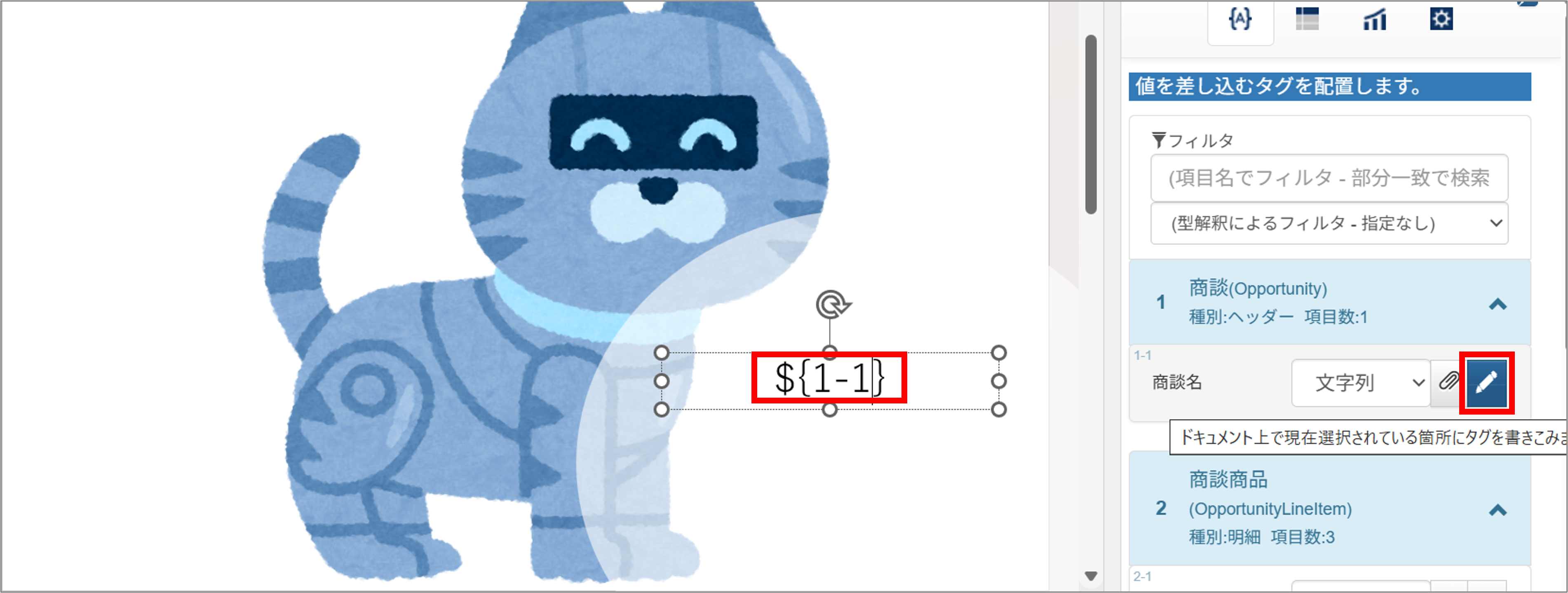 詳しいマッピング方法については、【帳票DX for Salesforce ユーザガイド(2)】OPRO Document Designer for Officeについての「2.項目のマッピング」を参照してください。