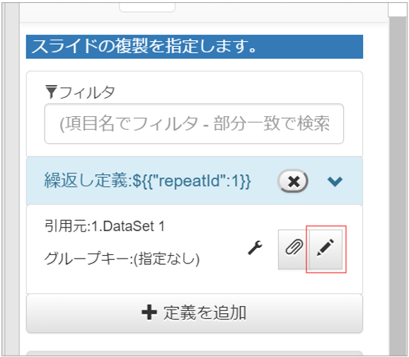 定義ボタンをクリックし、「定義を追加」ボタンをクリックして、複製条件を決めます。
