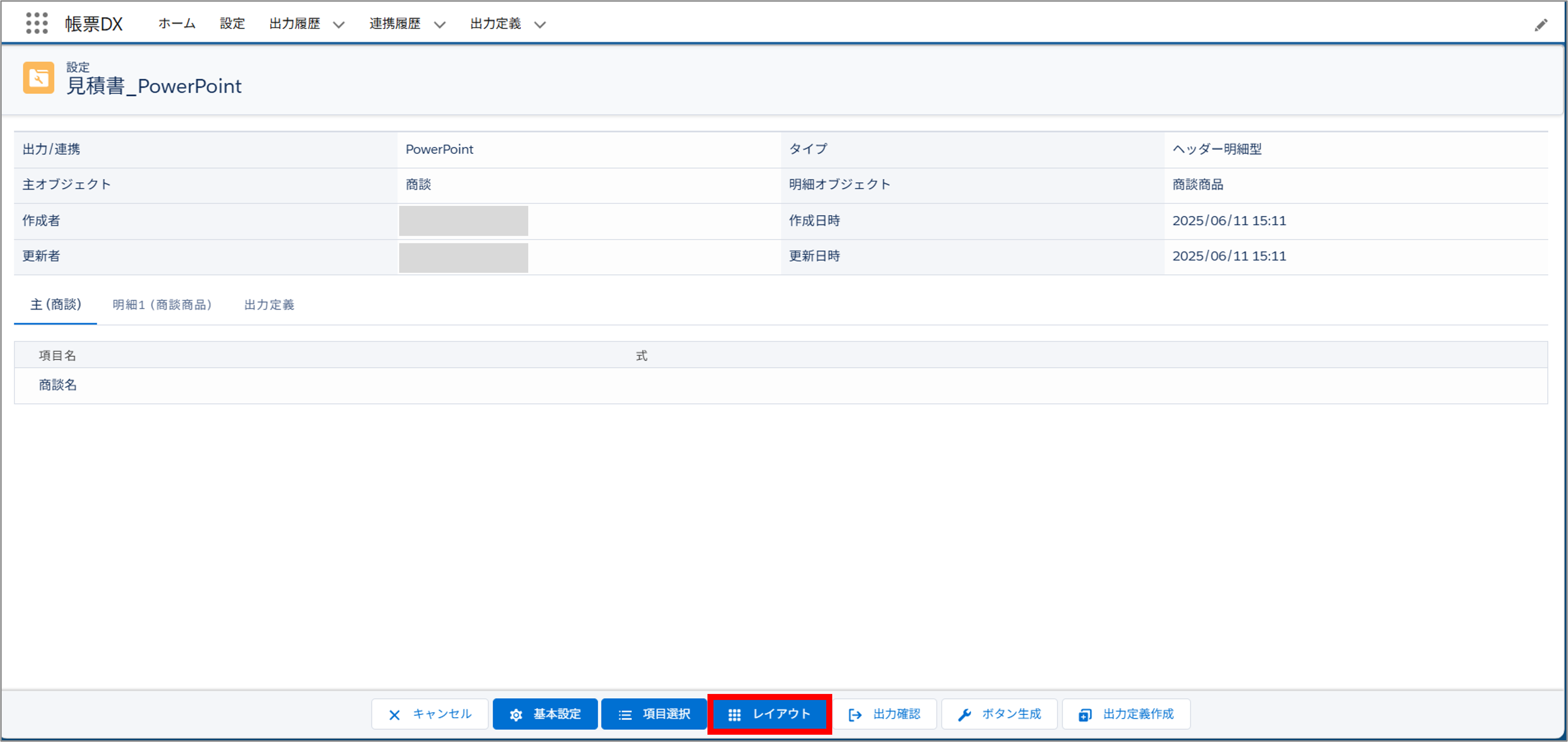 「【帳票DX for Salesforce ユーザガイド③】帳票作成」で作成した帳票設定の画面で、「レイアウト」ボタンをクリックします。