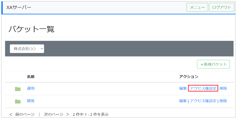 ①バケット一覧画面から「アクセス権設定」をクリックします。