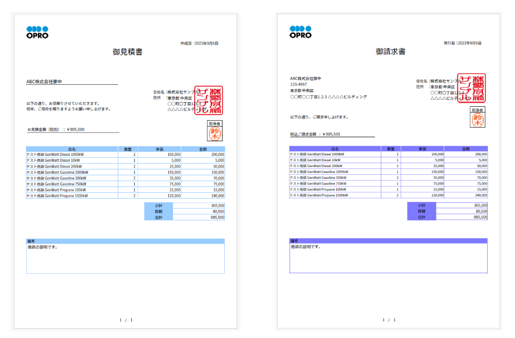記事に添付している帳票サンプルを使用すると、商談の項目を使用した見積書、請求書を作成できます。