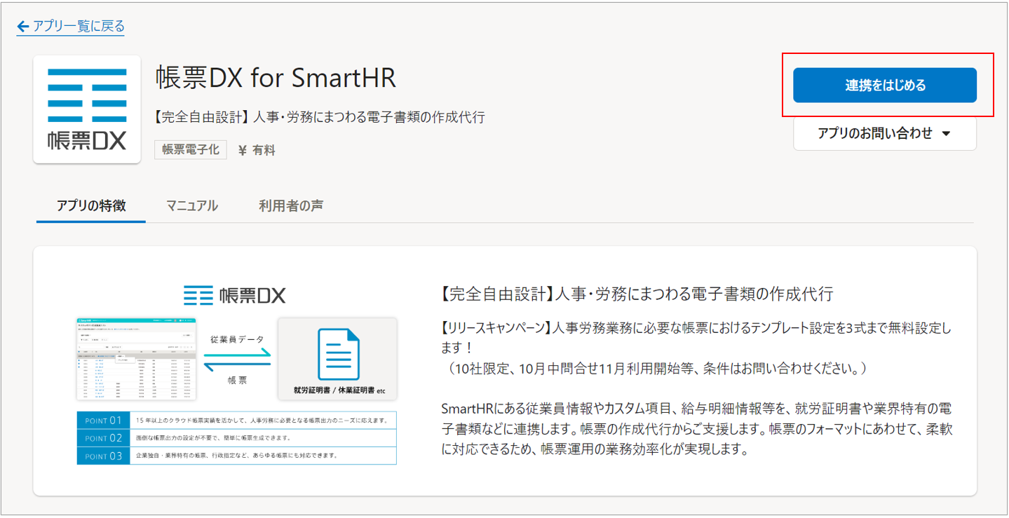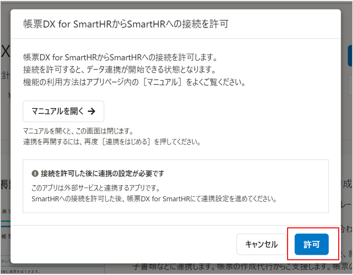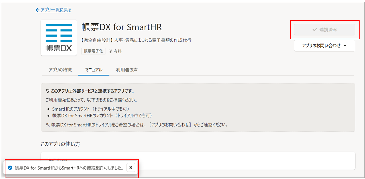 5.画面左下に「帳票DX for SmartHRからSmartHRへの接続を許可しました。」と表示され、画面右上の「連携をはじめる」ボタンが「連携済み」になっていたら連携が完了です。