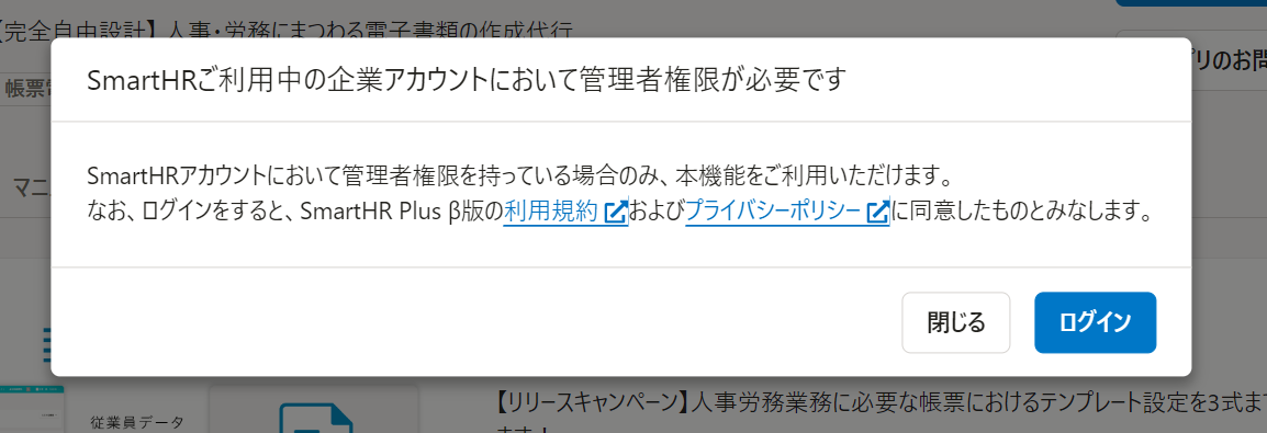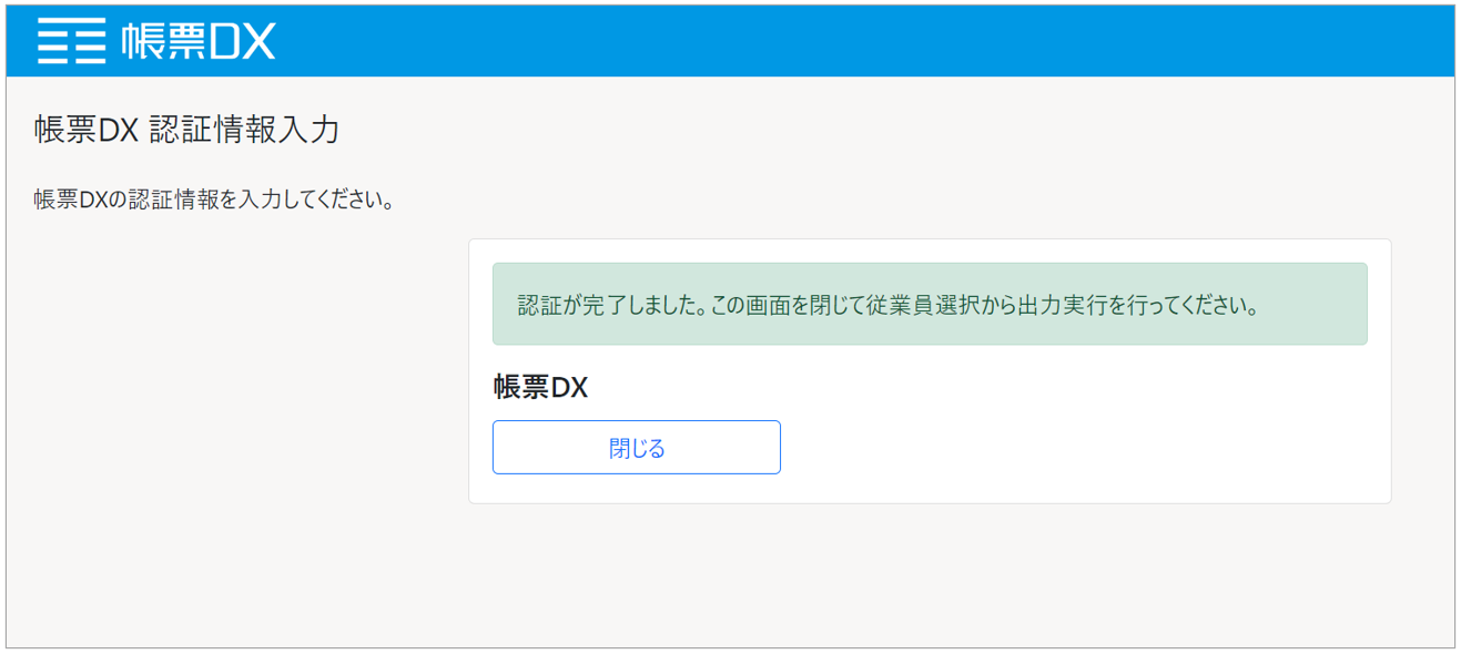 7.認証が成功すると、「認証が完了しました。この画面を閉じて従業員選択から出力実行を行ってください」と表示されますので、「閉じる」ボタンをクリックして⼀度ウィンドウを閉じます。