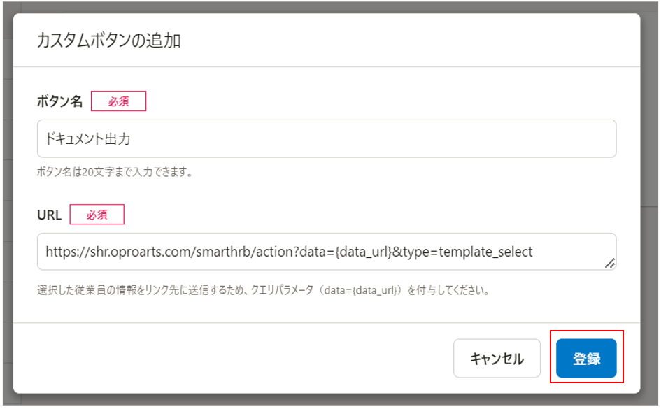 3.開いた「カスタムボタンの追加」ダイアログでボタン名と帳票DXと連携するURLを入力します。
