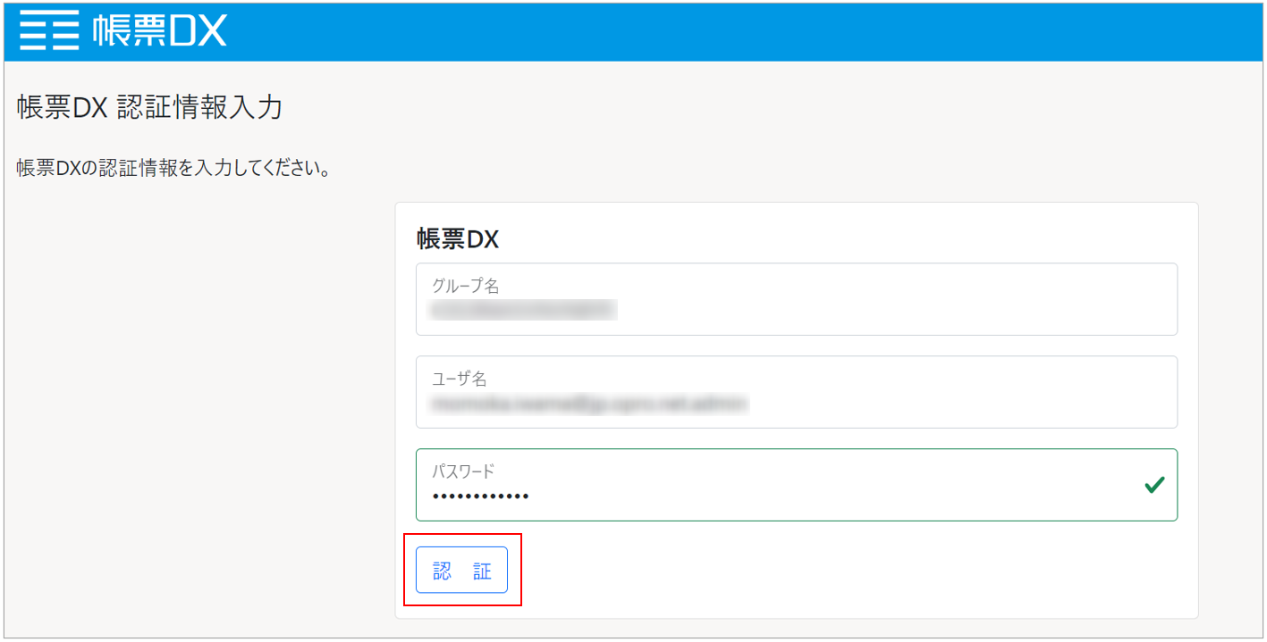 6.「帳票DX 認証情報⼊⼒」画⾯に遷移しますので、弊社より発⾏された認証情報を⼊⼒し、「認証」ボタンをクリックします。