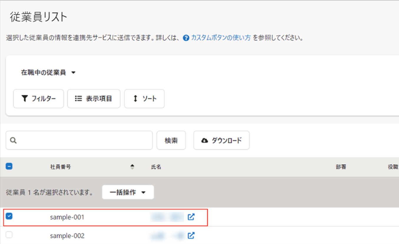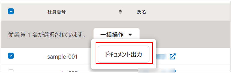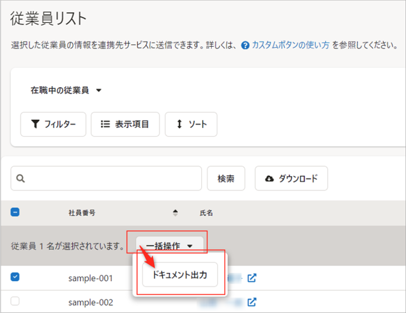 3.出力実行する従業員を選択後、「一括操作」ボタンをクリックし、カスタムボタンの設定(2.2.カスタムボタンの設置)で作成したボタンをクリックします。