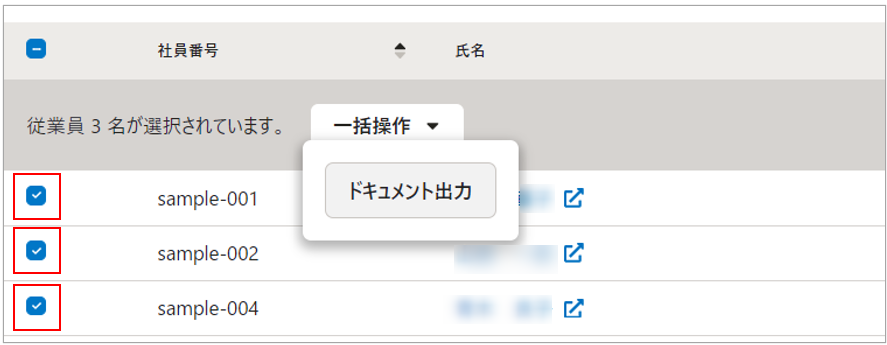 「従業員リスト」より複数従業員を選択(一度に1000名まで)して出力することができます。