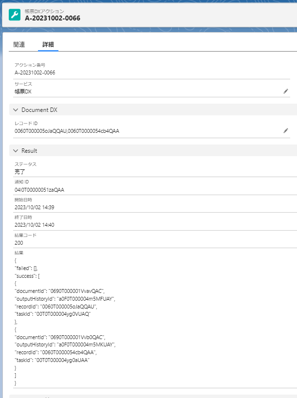 4.「帳票DX」アプリケーションの「出力定義」タブを開き、該当する「出力定義」を開き、出力定義の子として新規の「帳票DXアクション」のレコードが作成されている事を確認します。