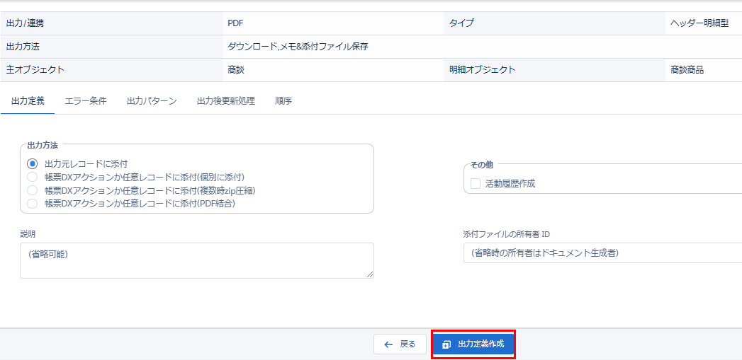 ・「帳票DXアクションか任意レコードに添付(個別に添付)」を選択した場合、「添付ファイルの参照先 ID」「添付ファイルの所有者 ID」