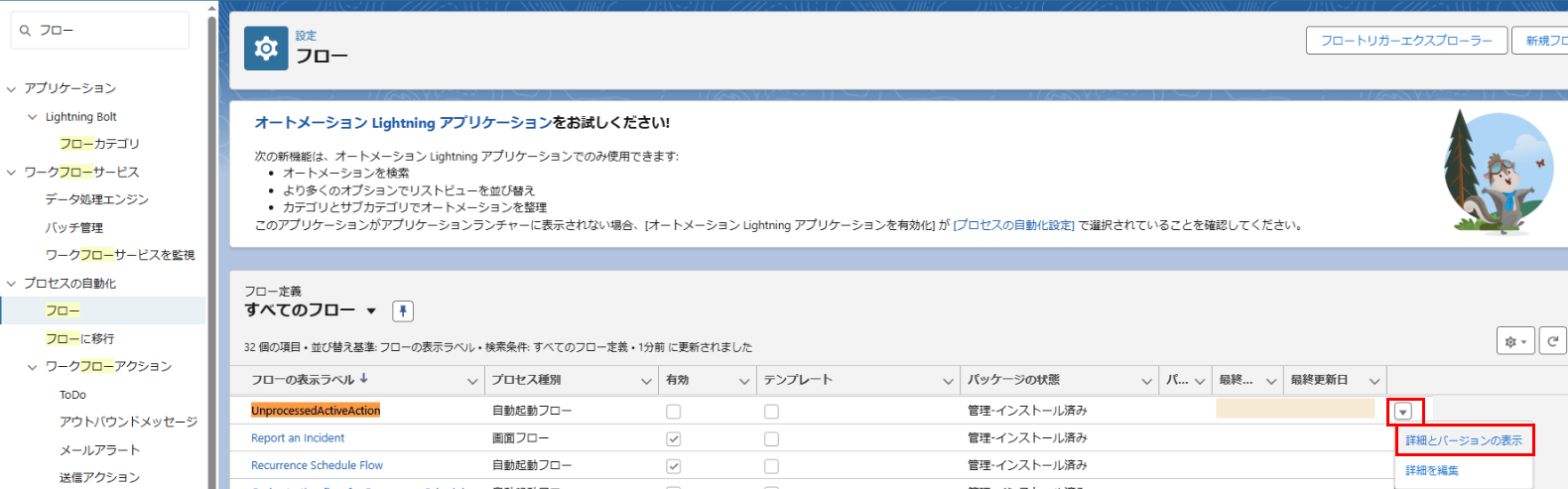 2.プロセスの自動化>フローを開き、「UnprocessedActiveAction」の右端の「▼」ボタンをクリックし、「詳細とバージョンを表示」をクリックします。