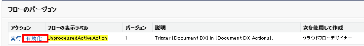 3.「フローのバージョン」の一覧内の、「バージョン」が最も新しい行の「有効化」をクリックします。