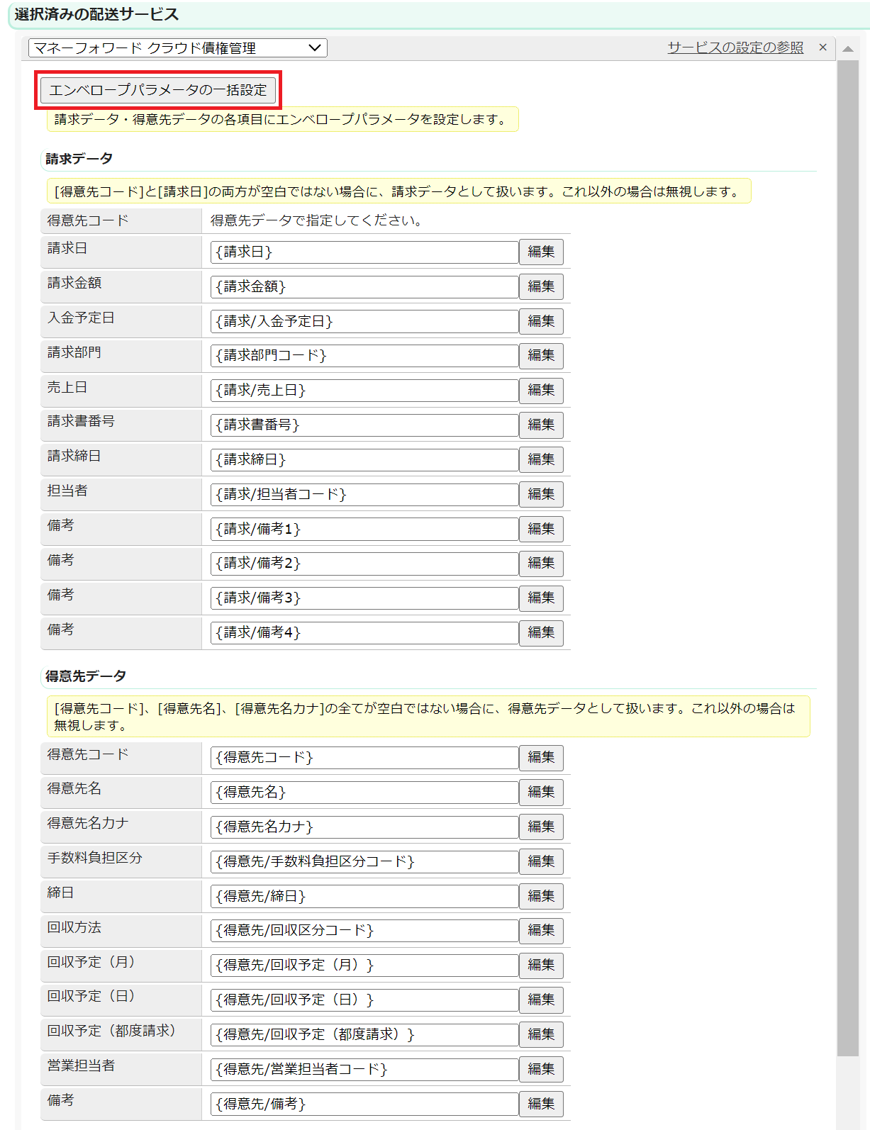 「マネーフォワードクラウド債権管理 請求データ登録」を基に作成したサービスを選択したら、「エンベロープパラメータの一括設定」をクリックして各項目のエンベロープパラメータを作成します。