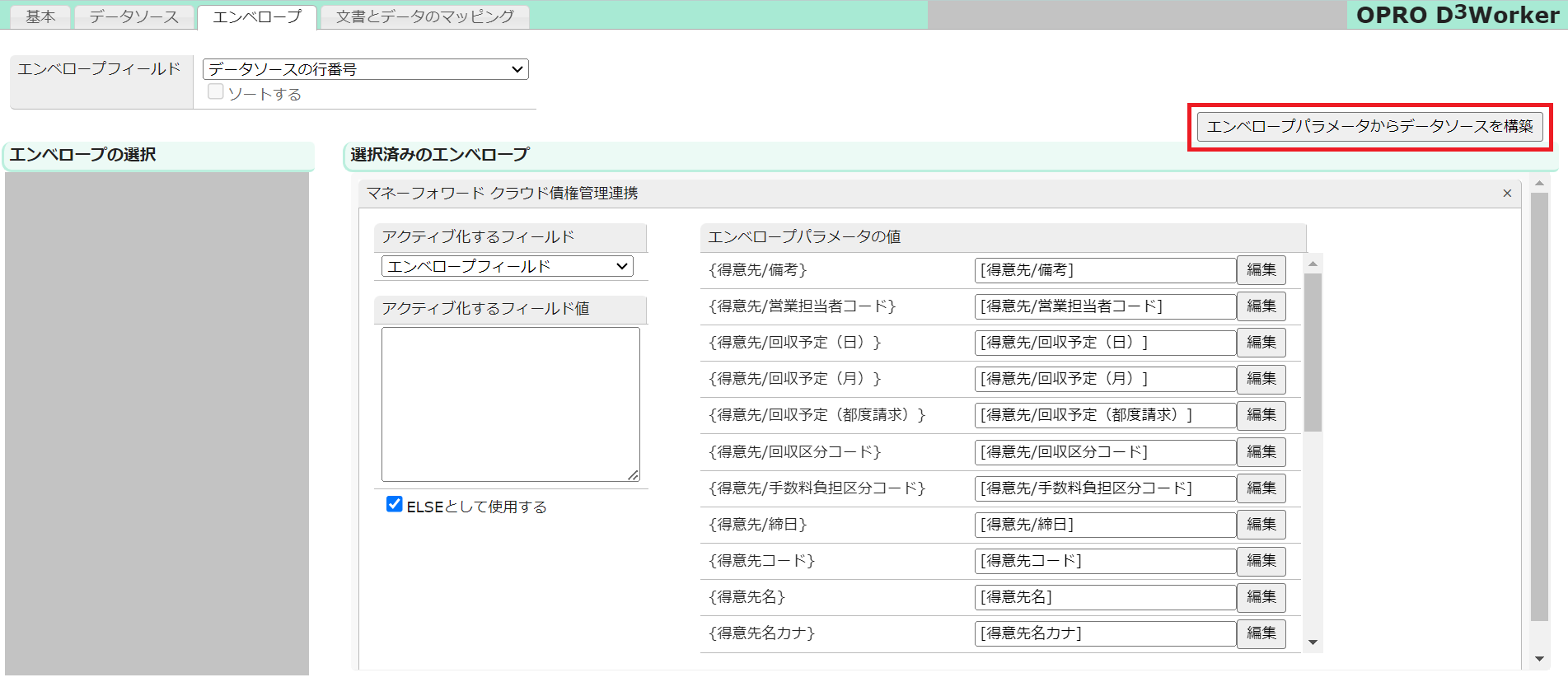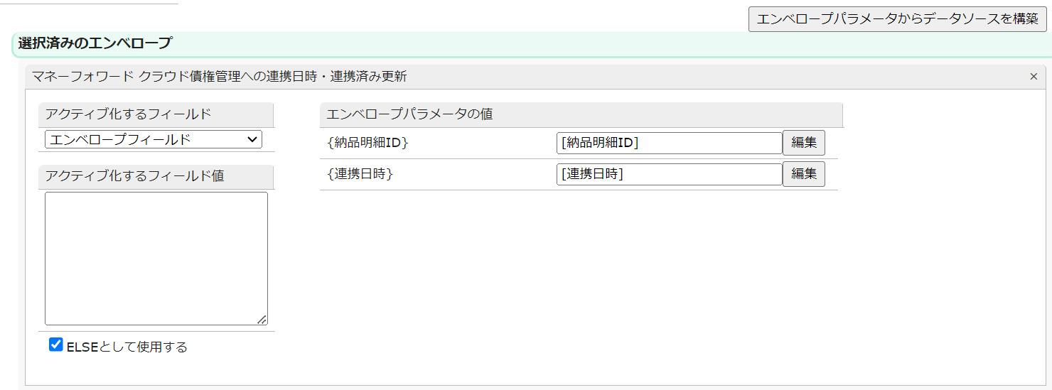 「エンベロープパラメータからデータソースを構築」をクリックすることで、エンベロープパラメータに対応するデータソースのフィールドが自動で生成され、それらがエンベロープパラメータの値として挿入されます。