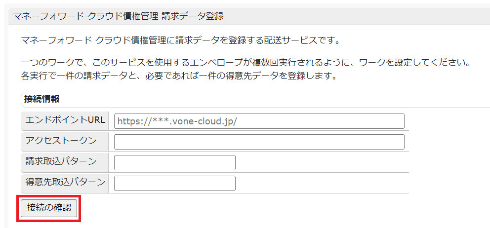 - マネーフォワードクラウド債権管理のAPIエンドポイントURL、アクセストークン、請求取込パターンNo.(事前準備で指定済みのもの)、得意先取込パターンNo.(事前準備で指定済みのもの)を入力し、「接続の確認」をクリックします。