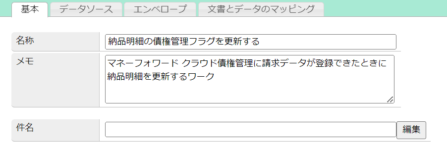 ここでの「請求データ登録後に実行するワーク」は、マネーフォワード クラウド債権管理への連携が成功した納品明細レコードの債権連携に関するフラグの値を更新するワークを指します。