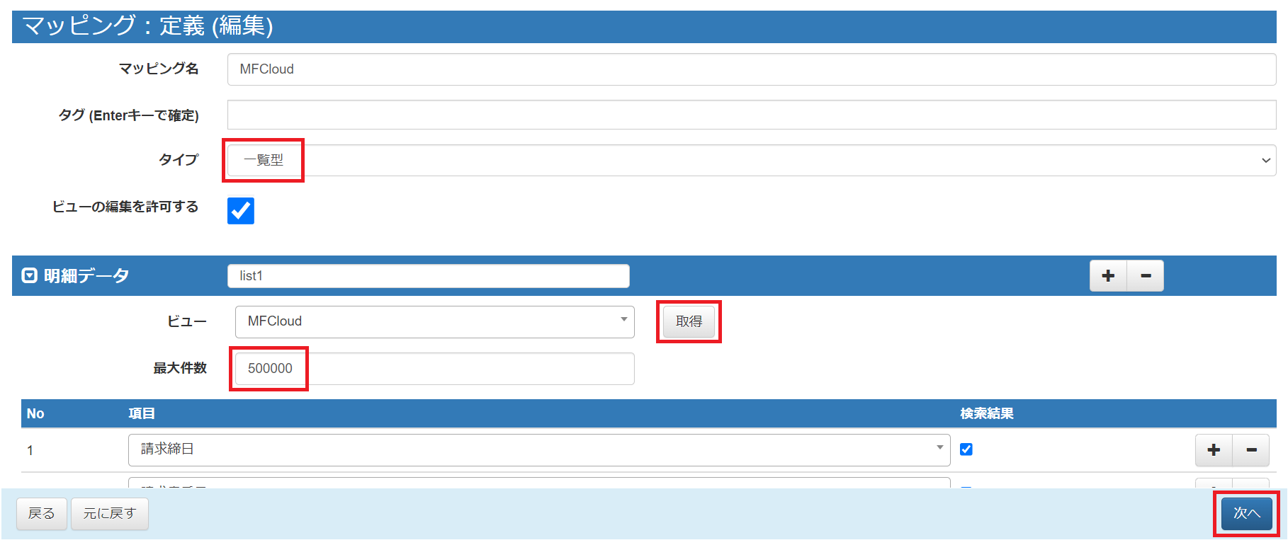 最大件数には500000を指定します。