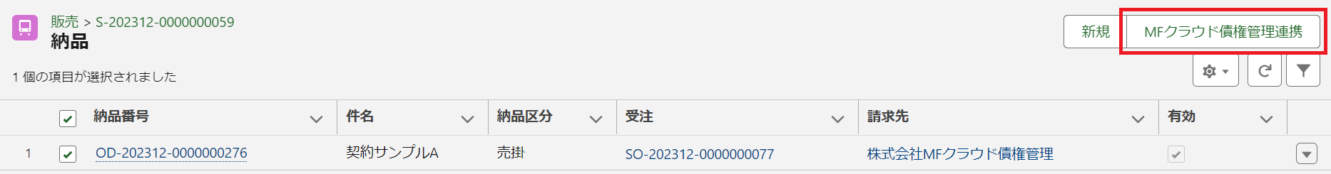 - 「請求済」がオンである納品に紐づく、「債権管理連携済み」がオフかつ「債権管理連携日時」が空である納品明細のみがマネーフォワード クラウド債権管理へ連携されます。