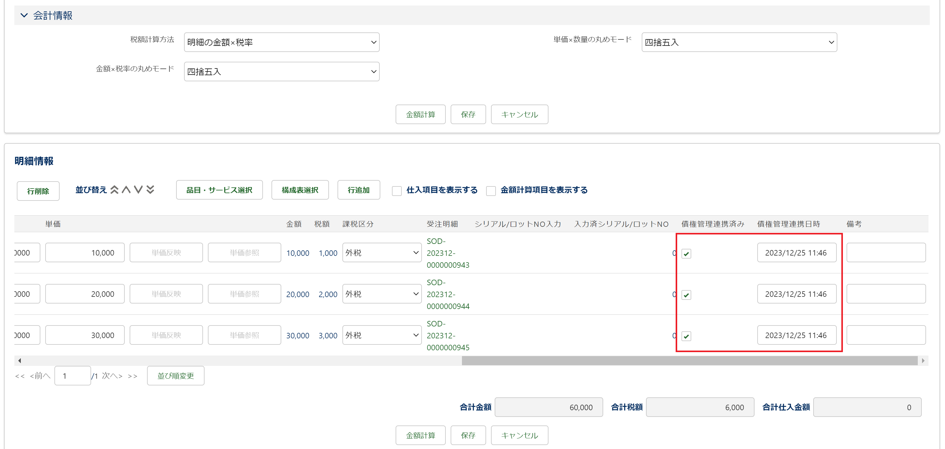 納品明細レコードの「債権管理連携済み」項目、「債権管理連携日時」項目も更新されています。