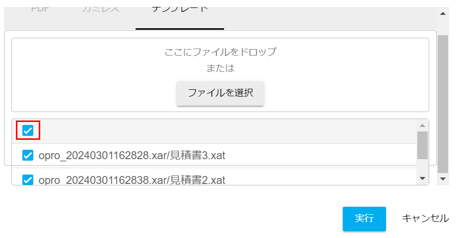 3.ファイル名横のチェックボックスクリックして、インポートするファイルを選択し、「実行」します。
