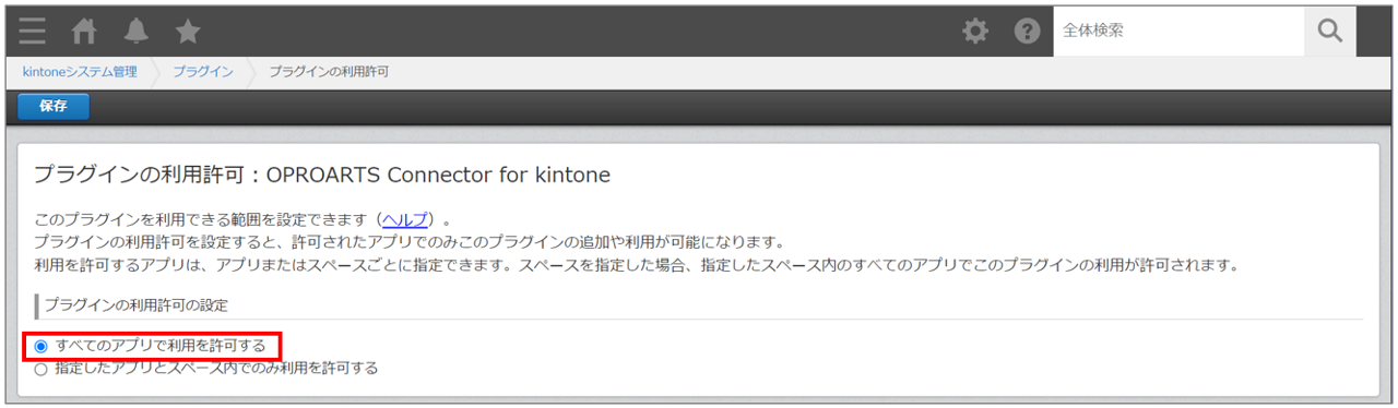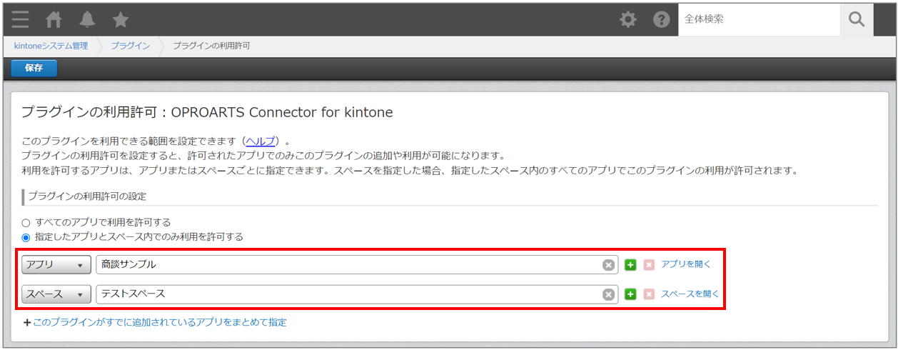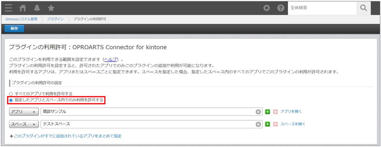 - 「指定したアプリとスペース内でのみ利用を許可する」が選択されている場合、以下のどちらかの設定を行い[保存]する