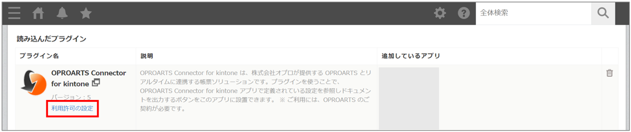 - プラグイン「OPROARTS Connector for kintone」または「ドキュトーン」の「利用許可の設定」を開く