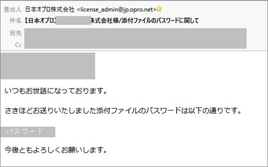 zipファイルにはパスワードがかかっており、パスワードは⑥のメールのすぐあとに送付されています。