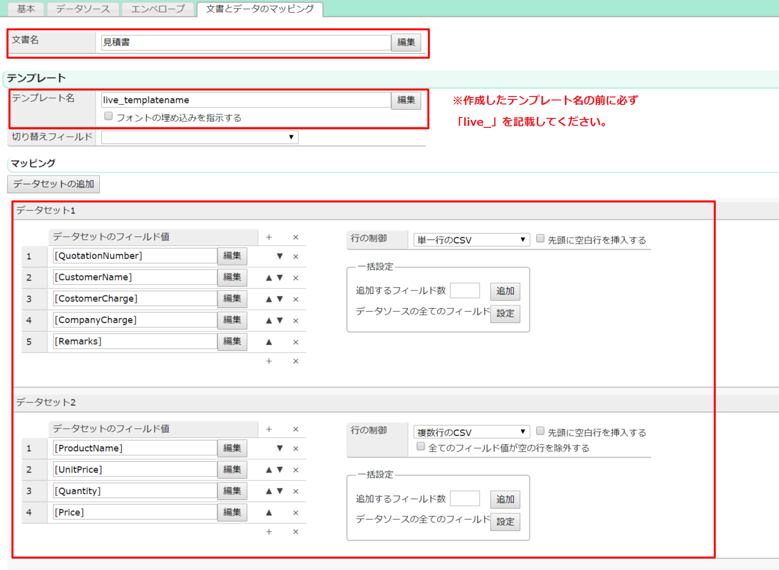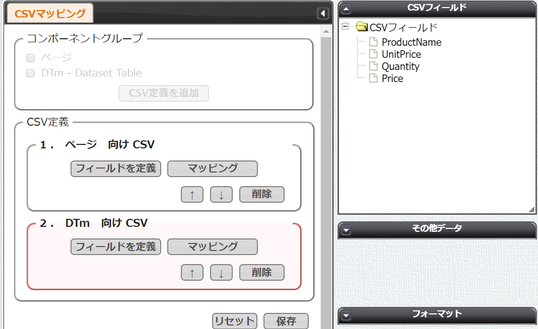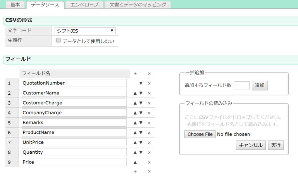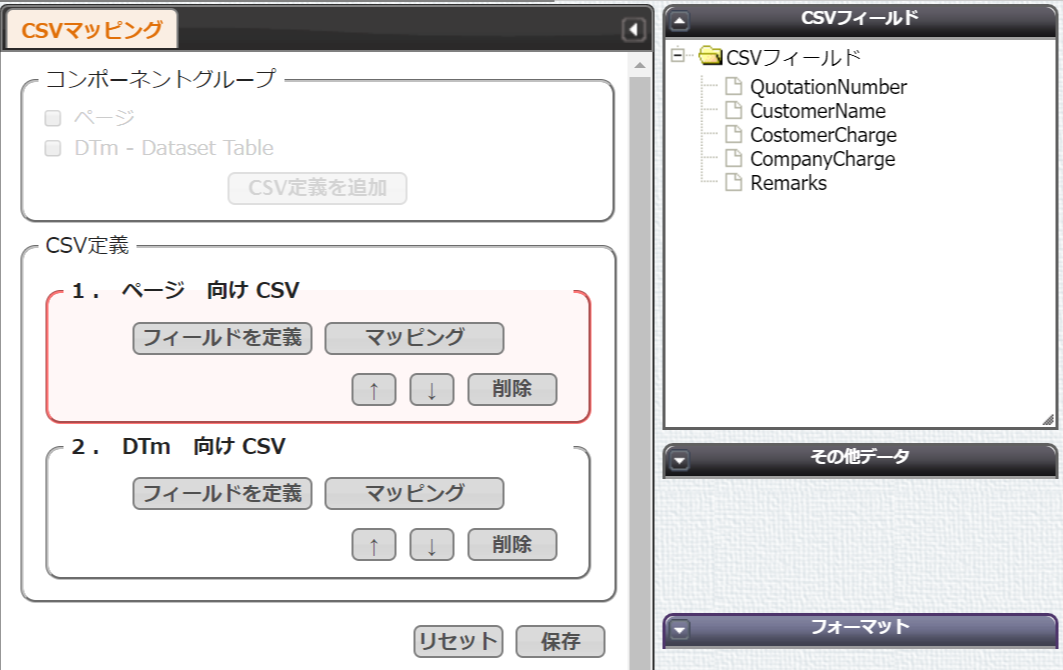 ・「マッピング」:デザイナに渡すCSVの形を作成します。