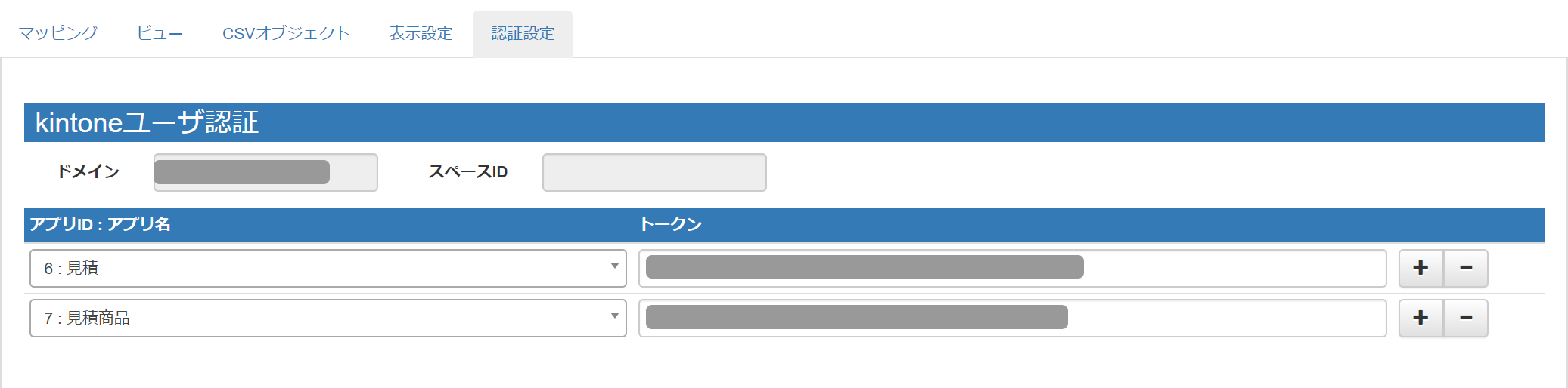 今回は「見積」アプリと「見積商品」アプリを使用するので、その2つのアプリのAPIトークンを取得して入力します。