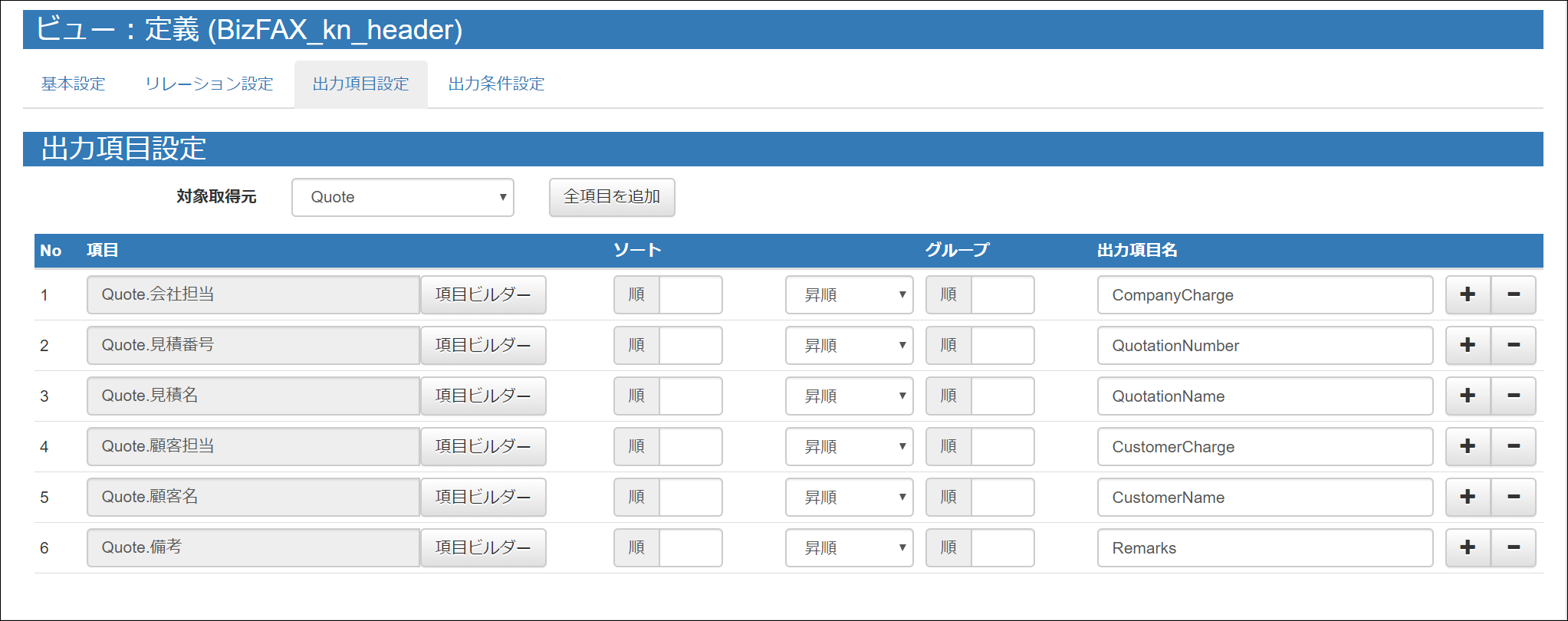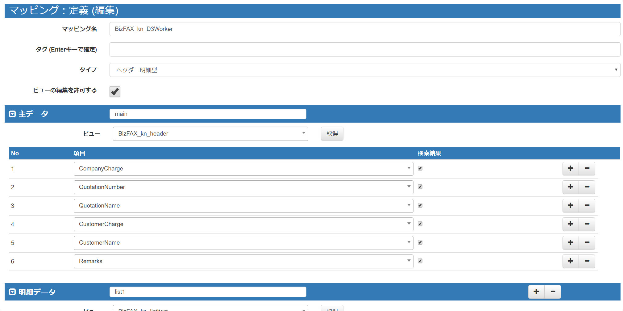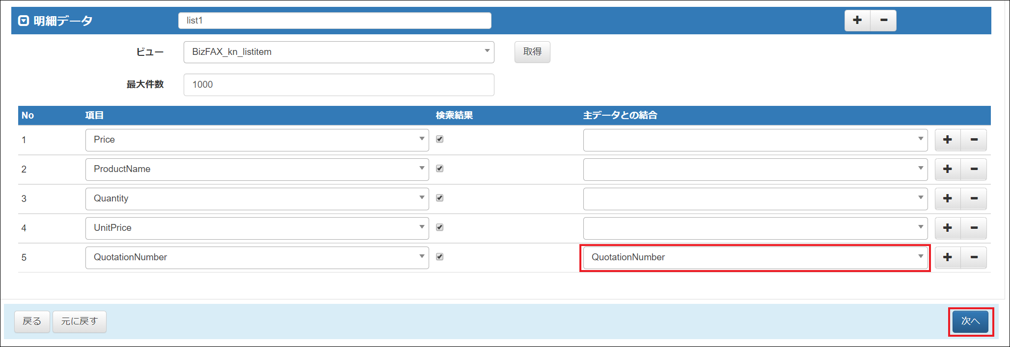 明細データでは、「主データとの結合」で明細データの「QuotationNumber」項目と主データの「QuotationNumber」を紐づけます。