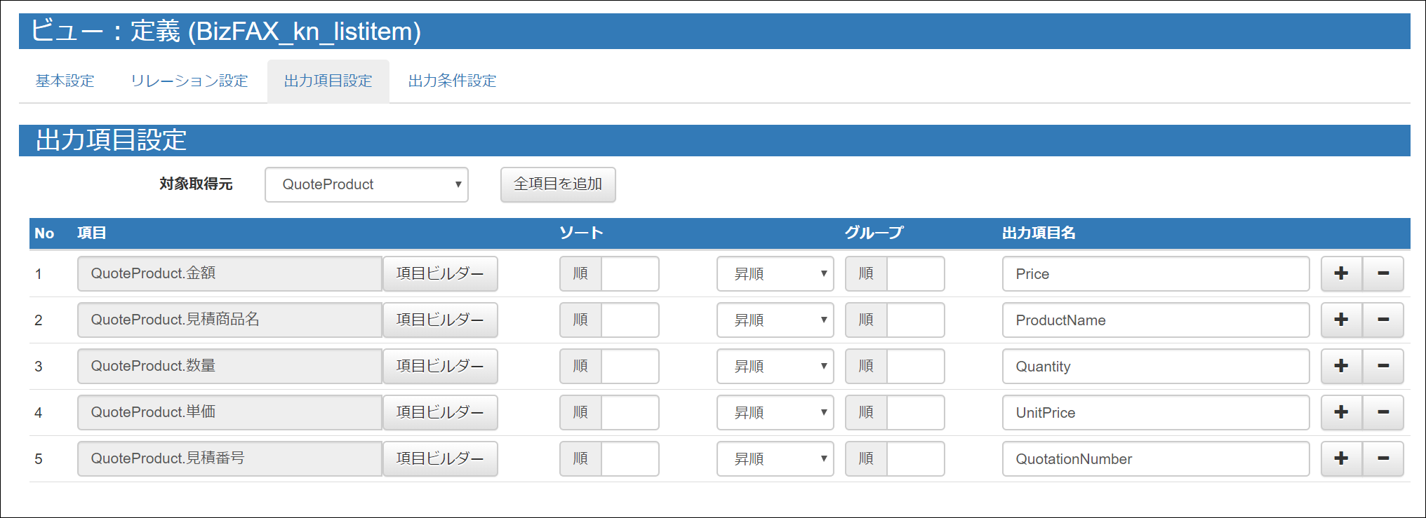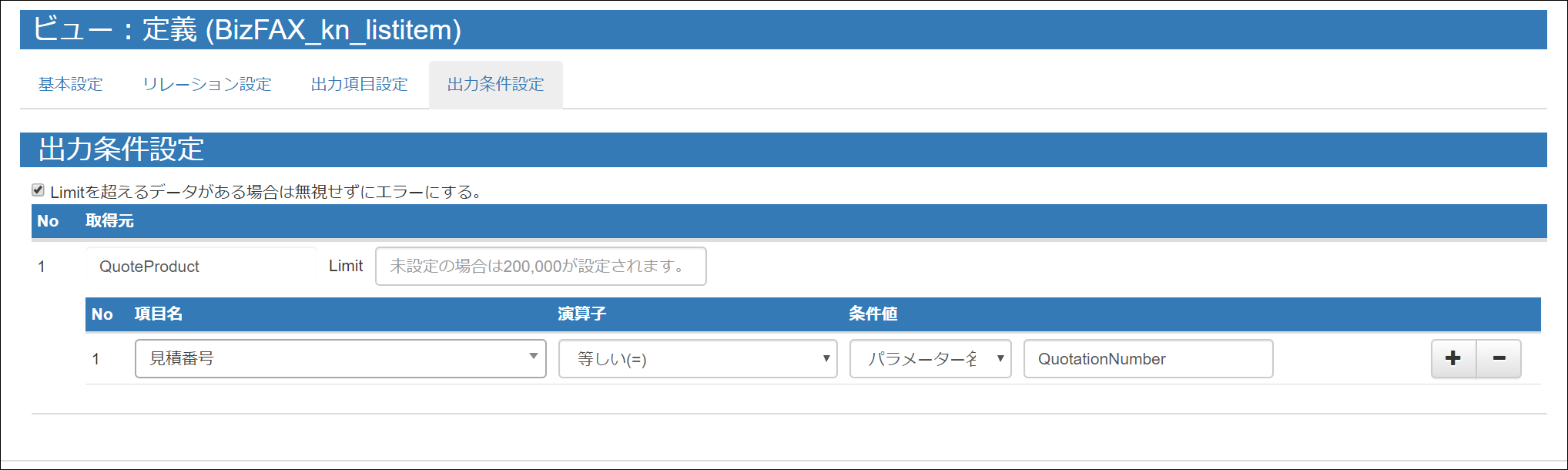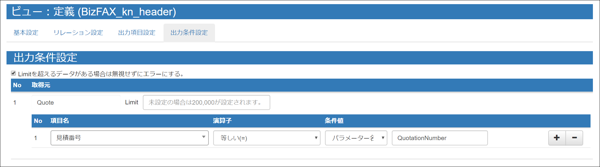 ヘッダービュー、明細ビューの両方とも、「見積番号」項目が「QuotationNumber」という名前のパラメータの値と等しいレコードについて抽出するように設定しています。