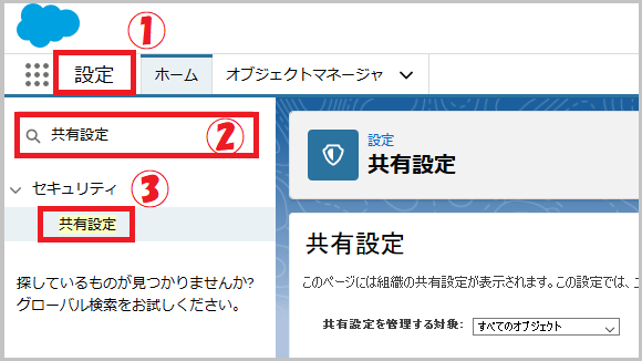 1.①[設定]から、②[クイック検索]ボックスに「共有設定」と入力し、③[共有設定]を選択します。