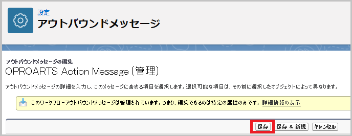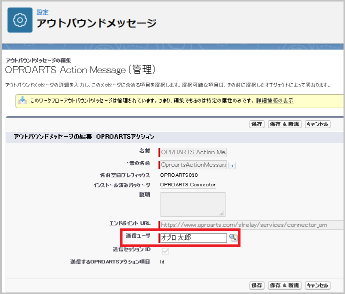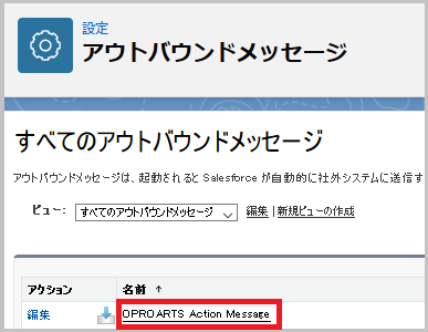「OPROARTSアクション」のレコードが作成されたときに、正しくアウトバウンドメッセージが送信されるようにするため、以下を設定します。