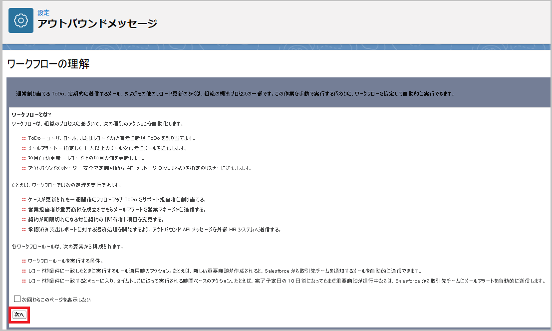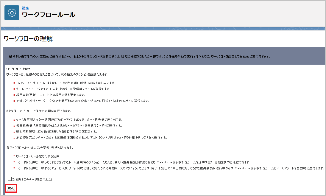 2.[ワークフローの理解]ページが表示されたら、[次へ]をクリックします。(表示されない場合もあります。)