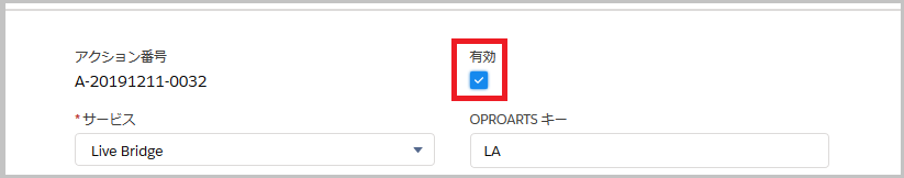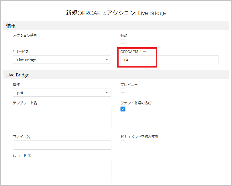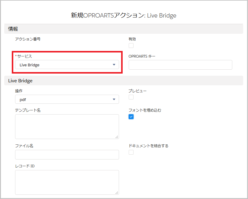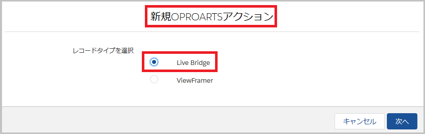 1.[新規OPROARTSアクション]の[レコードタイプを選択]で「Live Bridge」を選択します。